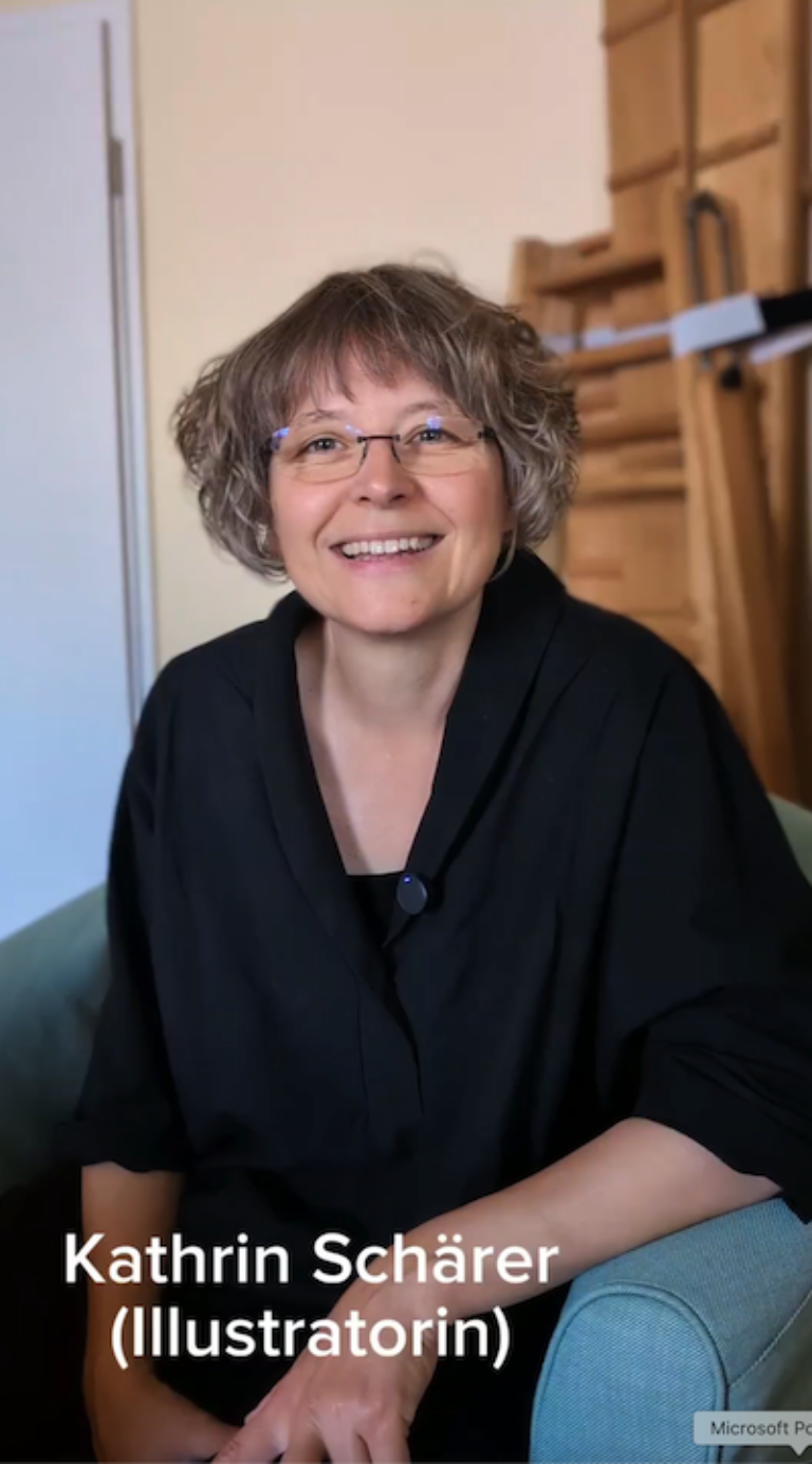Kathrin erzählte, wie ihre Bilder entstehen und wie man die Welt mit anderen Augen sehen kann. Natürlich kann ein Ziegenbock nicht fliegen – aber wenn man es sich vorstellt, öffnet sich eine ganze Fantasiewelt.