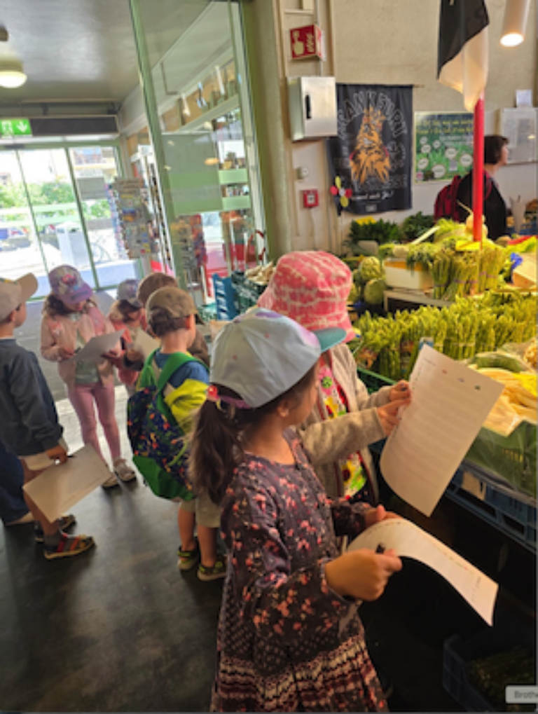 Unsere kleinen Expert:innen kennen die Ernährungspyramide – denn sie haben sie selbst aufgebaut! Im Supermarkt lernten sie, dass Äpfel und Karotten oft aus der Region kommen, Mangos aber per Flugzeug oder Schiff – weil sie in fernen Ländern wachsen.