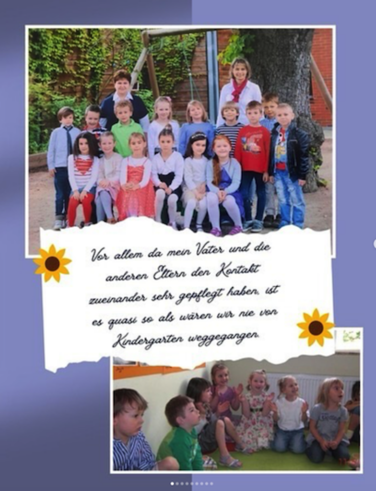 Und zweites auf jeden Fall die tiefe Verbundenheit der Kinder damals untereinander. Vor allem da mein Vater und die anderen Eltern den Kontakt zueinander sehr gepflegt haben, ist es quasi so als wären wir nie von Kindergarten weggegangen. Noch heute treffen wir uns mit meiner Kindergartengruppe und verstehen uns noch genauso gut wie damals. Wenn wir unter uns sind merken wir kaum Unterschiede zur damaligen und heutigen Zeit.